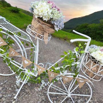 why not hire our rustic white bike with hessian bunting and flowers along with our matching potted Welcome sign.This is a real show stopper and captures those photographic moments.