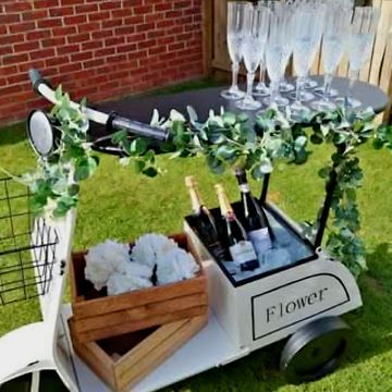Our beautiful Rustic Scooter champagne/cake/sweet stand is stunning at weddings really provides the Wow factor. Tray underneath cay be used as as an ice box. The basket on the front will contain flowers.