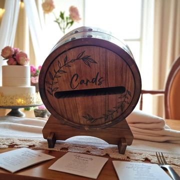 Our Uniqued shape of a whiskey barrel, our card box for wedding is crafted from natural brown pine wood, making it stand out