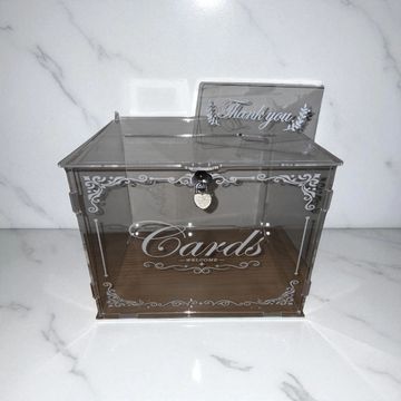 stunning dark wood card box, featuring a secure lock and intricate laser-cut design. It’s perfect for collecting envelopes, notes, and cash gifts while blending beautifully with rustic, boho, or romantic wedding themes.