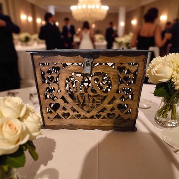 stunning wooden card box, featuring a secure lock and intricate laser-cut design. It’s perfect for collecting envelopes, notes, and cash gifts while blending beautifully with boho, or romantic wedding themes.