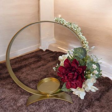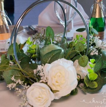 our candleholder in Silver/gold is a beautiful addition to any table. This works perfectly on long and round tables. The candleholder features a glass candle to the centre and a foliage trim. Flowers can be adapted to colour schemes.