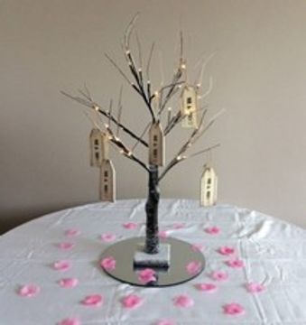 Our white wire trees can be adorned with various accessories (such as hanging globe tea lights or flowers)